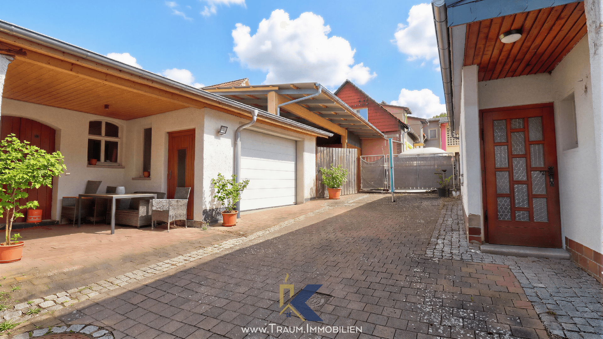 Ein besonderes Highlight des Hauses ist der Innenhof, der einen zusätzlichen privaten Außenbereich bietet. Hier befindet sich eine überdachte Sitzecke, die sich hervorragend für gemütliche Abende im Freien oder gesellige Stunden mit Familie und Freunden eignet.