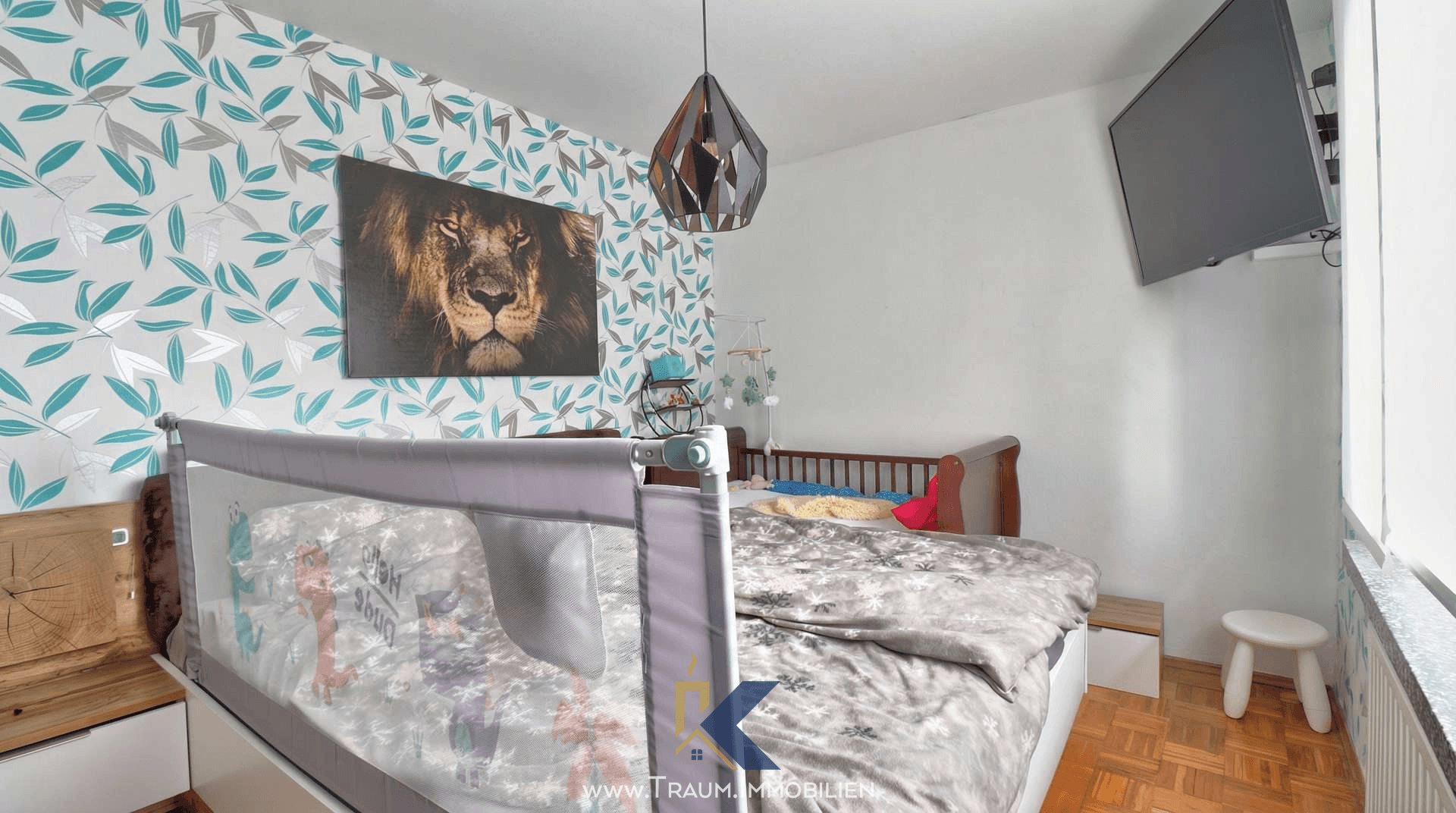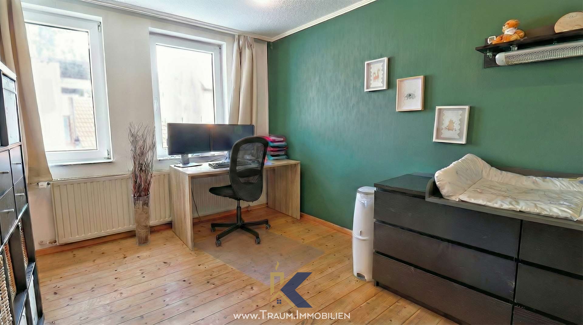 Das 1. OG bietet ausreichend Raum für eine Familie oder das Arbeiten von zu Hause. Hier befinden sich ein Kinderzimmer, ein Schlafzimmer, ein Büro sowie ein separates Ankleidezimmer. Ein weiteres Badezimmer auf dieser Etage sorgt für zusätzlichen Komfort.