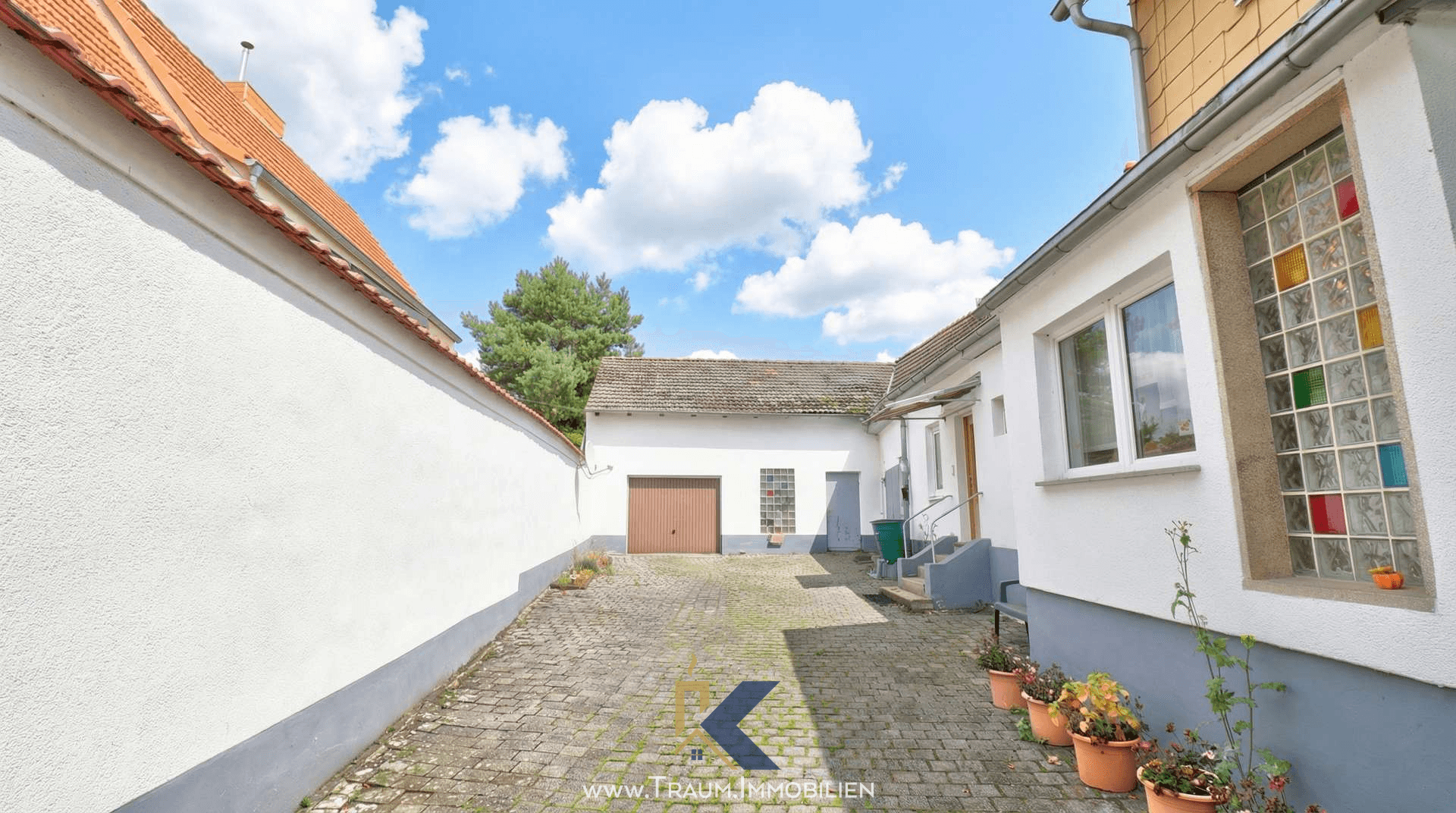 Der Innenhof ist durch eine Toreinfahrt abgetrennt und bietet ein geschütztes, privates Umfeld – ideal zum Entspannen, Arbeiten oder für Kinder zum Spielen. Im hinteren Bereich befinden sich eine praktische Werkstatt sowie eine angrenzende Scheune, durch die Sie direkt in den Garten gelangen. Auch der Heizungsraum ist bequem über den Hof oder die zweite Küche zugänglich.