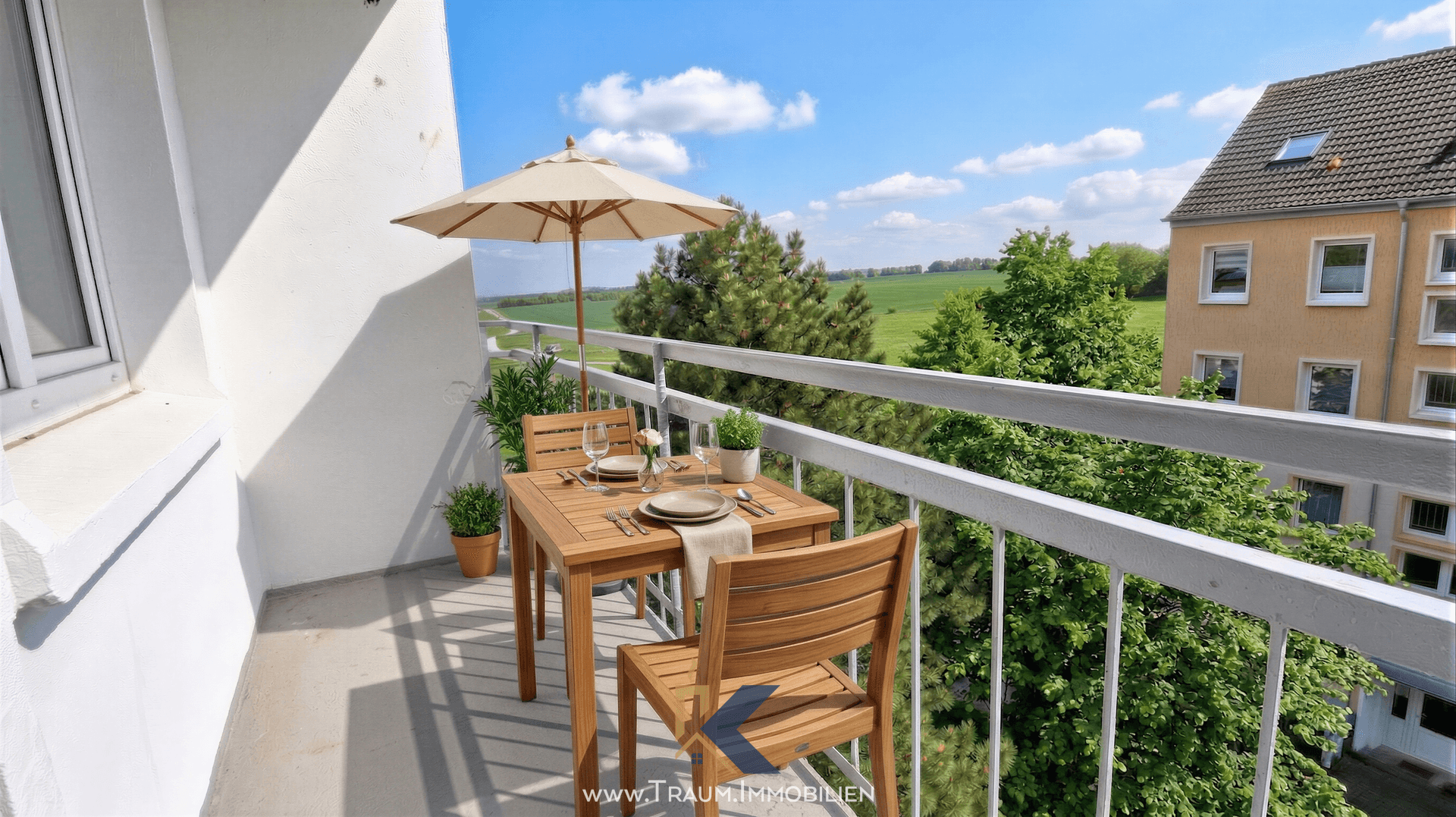 Vom Wohnzimmer aus gelangt man direkt auf den Südbalkon, der ideale Voraussetzungen für entspannte Stunden im Freien bietet. Er ist mit einer schaltbaren Außensteckdose ausgestattet, die sich beispielsweise für stimmungsvolle Beleuchtung oder die Installation eines Balkonkraftwerks eignet, welches durch die Südausrichtung optimal genutzt werden kann. Im Wohnzimmer befindet sich zudem eine TV-Dose mit Versorgung über eine hauseigene Satellitenschüssel, wodurch keine zusätzlichen Kabelgebühren anfallen.
