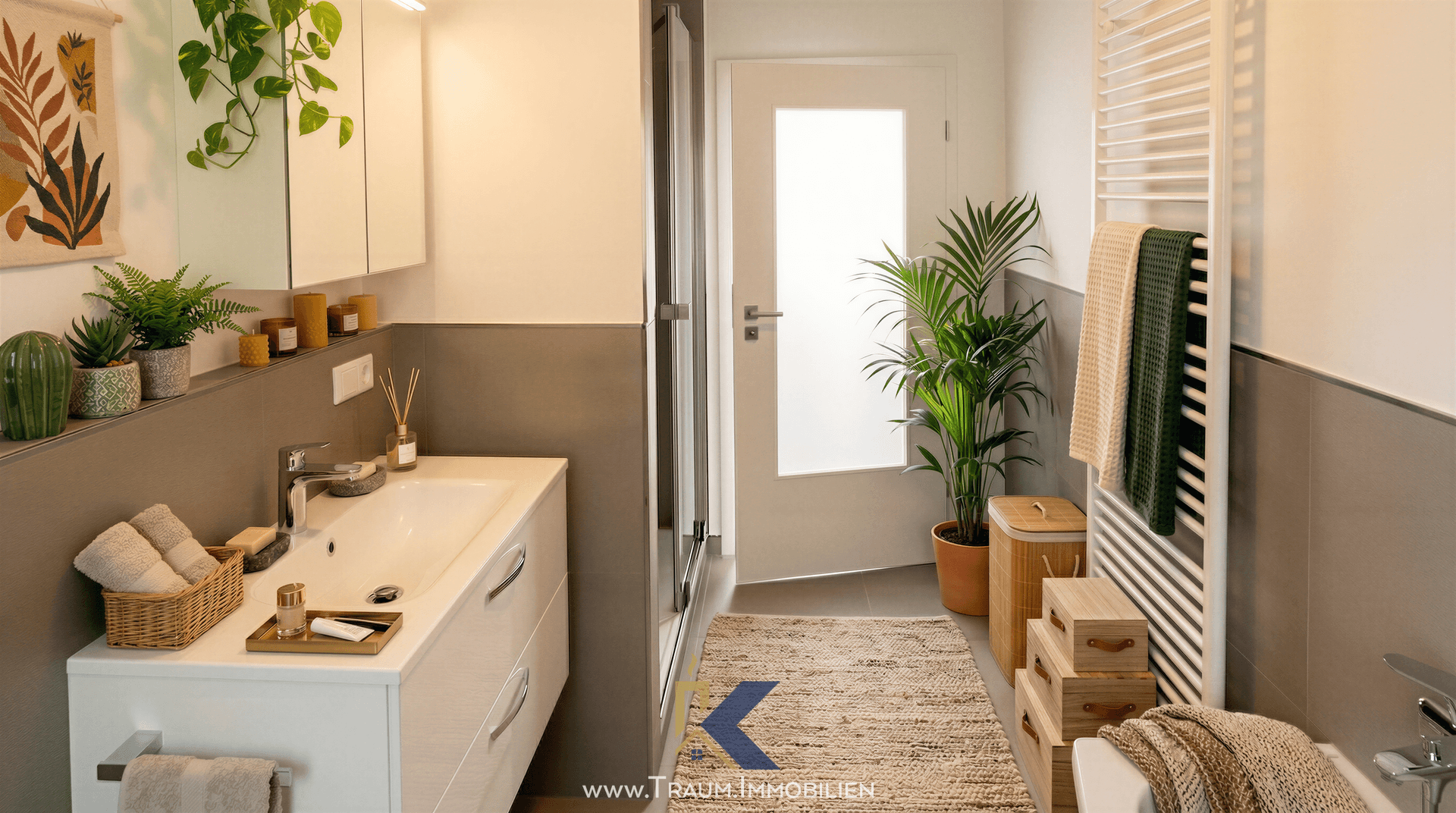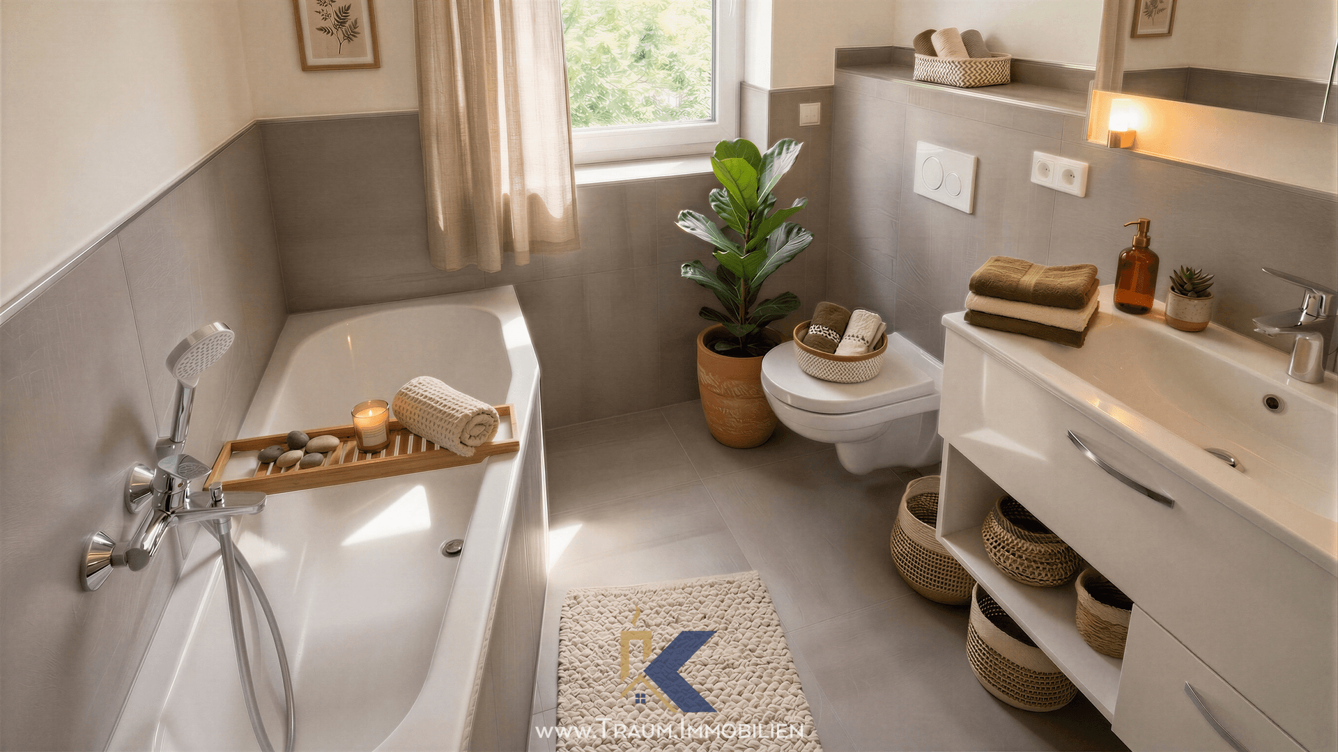 Das Tageslichtbadezimmer lässt ebenfalls keine Wünsche offen und bietet sowohl eine Dusche mit den Maßen 80 cm x 120 cm als auch eine Badewanne. Darüber hinaus verfügt es über einen modernen Waschtisch, eine automatische Badezimmerlüftung, einen stilvollen Handtuchheizkörper sowie einen beleuchteten Spiegelschrank.